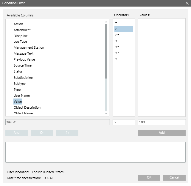 • The Condition Filter dialog box displays.