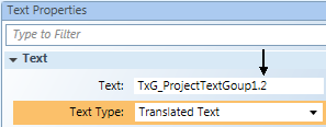 - The object reference is added to the Text field, for example, TxG_ProjectTextGroup.2.
