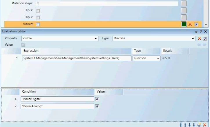 In this evaluation, the Expression field contains the data point, and the Function Type filter is applied. The Discrete evaluation states that if the condition of the data point is of the Function BoilerDigital or BoilerAnalog, then the value (property) is visible.
