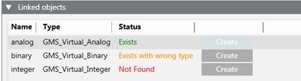 • Not found or Exists with wrong type: The required object does not exist or exists with a different type. To fix this issue, click Create to add the missing object to the Desigo CC project.