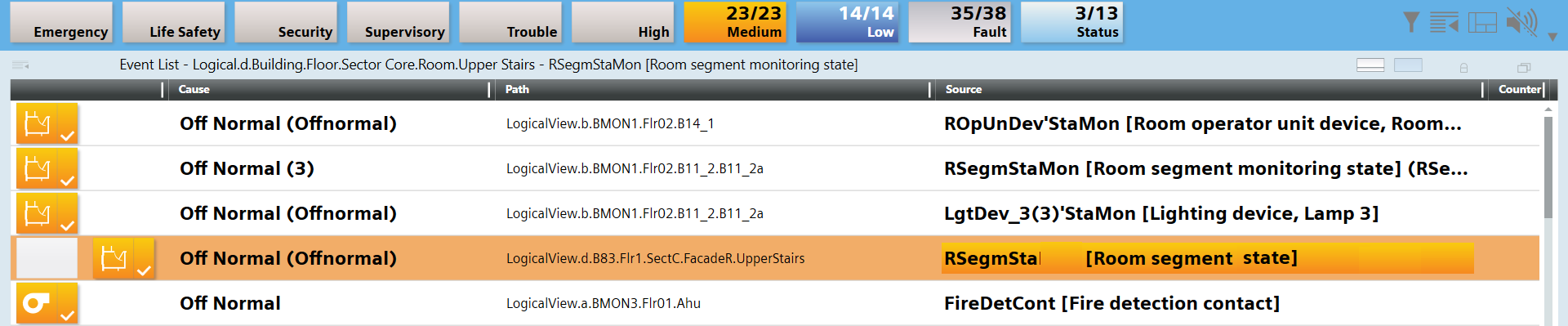 Scenario: A fault occurs in a room that is recognized by the system with the Common Event object and is displayed in the Summary Bar. All faults belonging to a room are displayed in the Common Event view. This also applies to objects that are not in the system database through Application Modelling.
