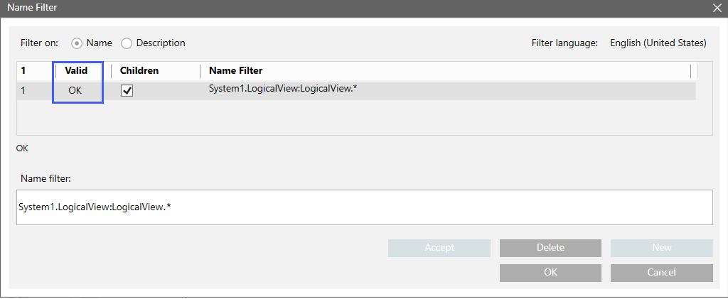 b. In the Name Filter dialog box, check the predefined path for validity and change as needed. In Valid column must show OK.
