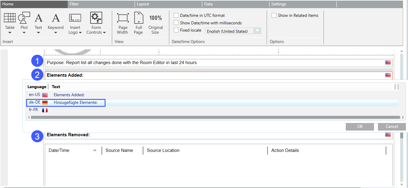 1. Enter a localized text (1, 2 and 3) for the standard report.