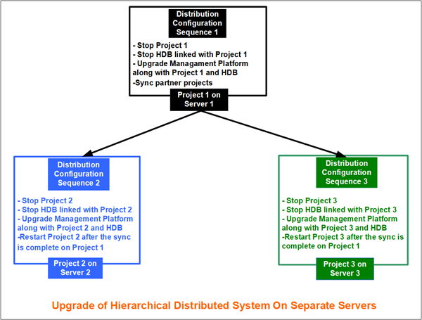 You want to upgrade an existing hierarchical distributed system deployed on 3 separate systems (for example, Server 1, 2 and 3) to the latest version.