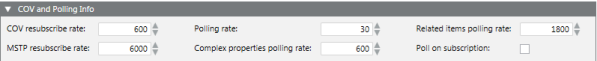 The COV and Polling Info expander contains the default values for data reporting. Usually, default values are optimal. However, you can change the default values if the network traffic is high.