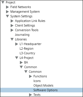 • The Software options folder is created at Project > Settings > Libraries > [L2-Region, L3-Country or L4-Project] > Common > Common.