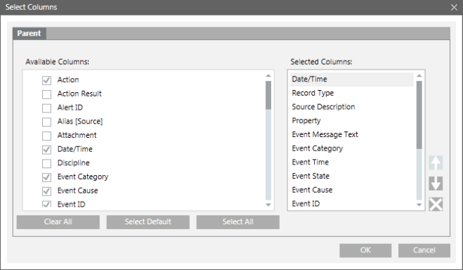The Select Columns dialog box allows you to add, remove, or reorder columns in a log view. You can access this dialog box using any of the following methods:
