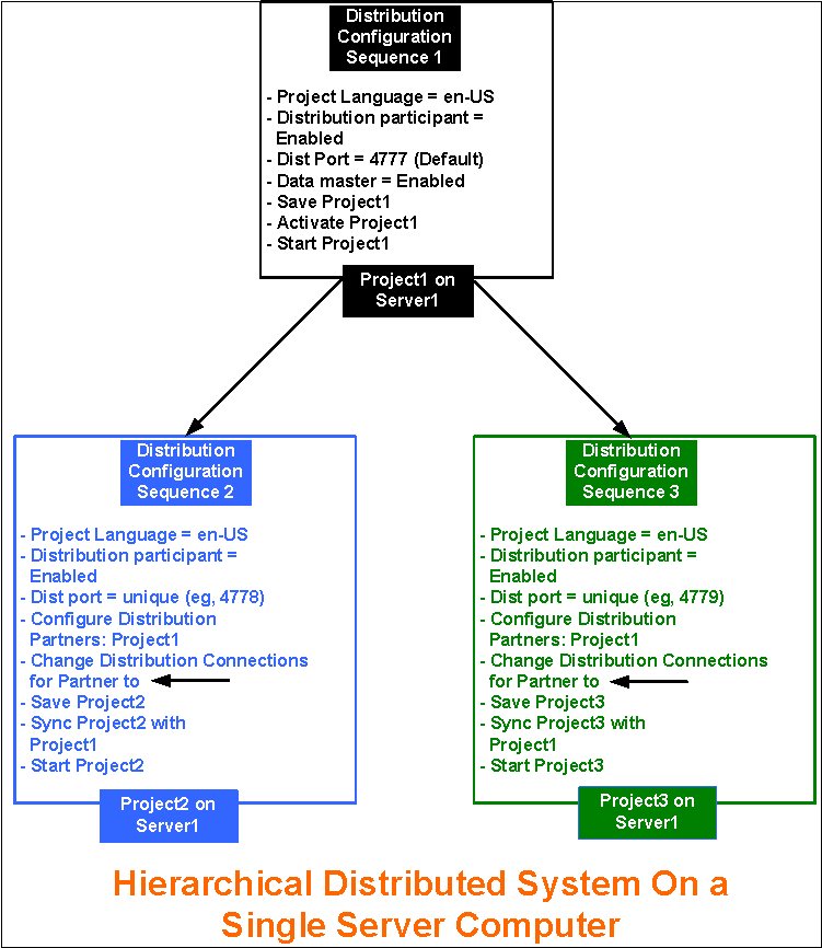 - Since the distribution connection is unidirectional, you can set up Hierarchical distributed systems on a single server. When you sync, the distribution connection is aligned on Project1 so that
