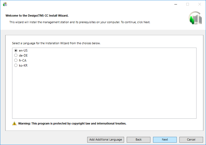 • Accept the default language selection. The installation language of the OS is the default language if the language pack is available; otherwise, en-US is used. The Welcome to the Desigo CC Install Wizard dialog box and all related messages on this dialog box, however, always display in en-US.