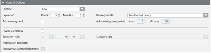 • Control Options: Configure the message priority, escalation with other details like delivery mode and expiration time.